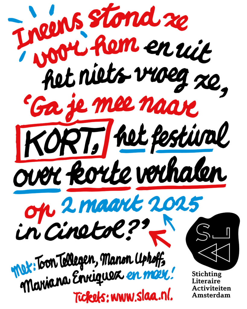 2 maart 2025: weliswaar buiten de Week van het Korte Verhaal, maar zéér bezoekwaardig: KORT-festival over korte verhalen van SLAA, met Mariana Enriquez, Manon Uphoff en Gijs Scholten van Aschat (in editie van Uitgelezen Verhalen). Van 15.00 tot 22.00 uur; meer informatie.